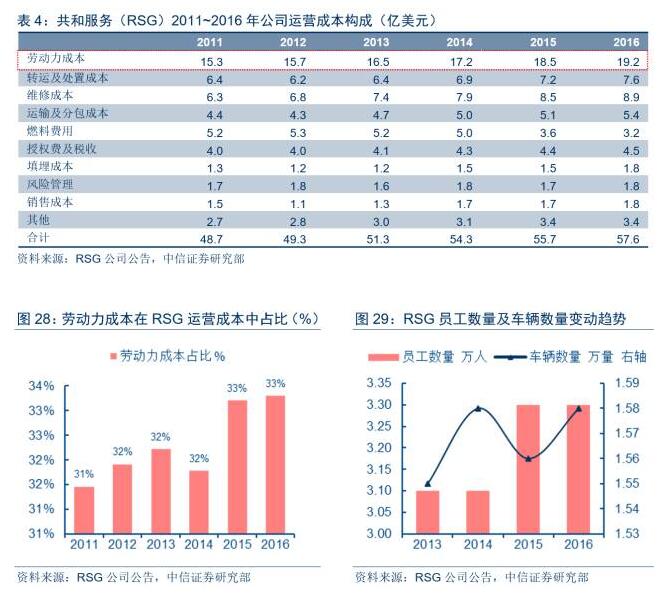 美國生活垃圾的清掃與收集基本實現(xiàn)完全機械化,由居民先行實施垃圾分類處理,環(huán)衛(wèi)工人直接通過駕駛特制裝載車收集社區(qū)住戶附近垃圾桶內(nèi)的廢棄物,然后將市政廢物運往垃圾轉(zhuǎn)運中心或者最終處理設施。以共和服務(RSG)為例,從員工數(shù)量和公司機械設備數(shù)量看,RSG的員工數(shù)量和車輛數(shù)量大體維持在2:1的水平;在2011~2016年公司運營成本構成中,勞動力成本在公司運營成本占比穩(wěn)定維持在31%~33%的區(qū)間內(nèi),顯著低于國內(nèi)環(huán)衛(wèi)市場中的勞動力成本占比。由此可見,通過持續(xù)不斷的機械化替代,廢物管理市場各參與方的勞動力成本規(guī)模和占比確實可以實現(xiàn)有效控制。