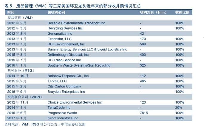 在市政廢物管理市場目前面臨廢物產(chǎn)生量增長緩慢和資源循環(huán)利用的不利因素下,通過外延并購也是企業(yè)提升收入和加速成長的重要手段。廢品管理(WM)等三家龍頭公司在過去幾年中持續(xù)實施外延并購,以提升市場占有率和企業(yè)定價能力。從并購對象標的類型看,大型及小型公司、前端收集及后端處置公司等均有涉及。