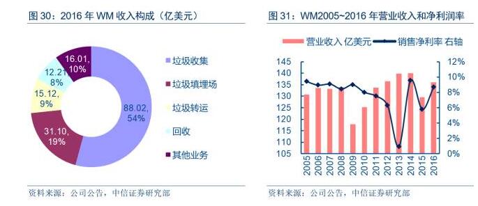 廢品管理(WM)是北美規(guī)模最大固廢處理公司,目前共擁有2.2萬輛垃圾收集車輛,4.12萬名員工,262個填埋場,310個固廢中轉(zhuǎn)站,120家資源回收中心和17家垃圾焚燒發(fā)電廠,服務美國、加拿大和波多黎各等2,700萬戶工商業(yè)和居民客戶。2016年,公司營收規(guī)模為136.09億美元,凈利潤為11.82億美元,目前市值約330億美元,是標普500指數(shù)成分股。