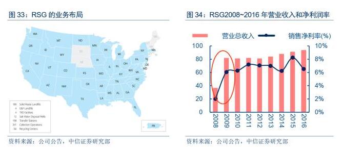 1981年,公司前身RepublicIndustry作為垃圾處理公司成立;1998年,RepublicIndustry將共和國服務公司(RSG)分拆上市;2008年6月,RSG以61億美元的股票收購其較大的競爭對手AlliedWasteIndustries,一舉成為美國第二大廢物管理公司。大體量并購推動公司營業(yè)收入從2008年的36.85億美元上升到2009年的81.99億美元,同比上升122.49%;凈利潤從2008年的0.74億美元上升到2009年的4.95億美元,同比上升570.73%。