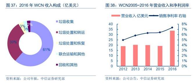 從收入規(guī)模看,廢物聯(lián)合公司(WCN)是北美第三大固體廢物服務公司,也是北美領先的油田廢物處理公司,在美國和加拿大提供垃圾收集、轉(zhuǎn)運、處置和回收服務。截至2016年末,公司經(jīng)營261個固體廢物收集操作網(wǎng)絡,135個轉(zhuǎn)運站,7個聯(lián)運設施,71個回收中心,93個垃圾填埋場,22個E&P液體廢物注入井和17個E&P廢物處理和采油設施。客戶涵蓋美國40個州和加拿大5個省份的住宅、商業(yè)、工業(yè)和E&P客戶。2016年公司實現(xiàn)營業(yè)收入33.76億美元,凈利潤2.47億美元。