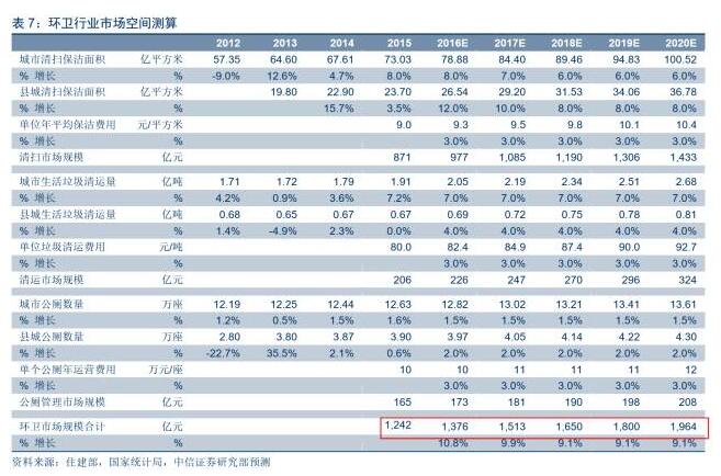 目前城市道路年清掃市場價格普遍在8~12元/平方米,假設2015年國內(nèi)清掃均價為9元平方米;清運均價普遍在70~90元/噸,假設2015年國內(nèi)清運均價為80元/噸;國內(nèi)公廁維護價格普遍在8~12萬區(qū)間內(nèi),假設2015年國內(nèi)公廁年維護均價為10萬元;我們假設清掃、清運及公廁維護價格的年均漲幅為3%,和通脹水平基本接近;