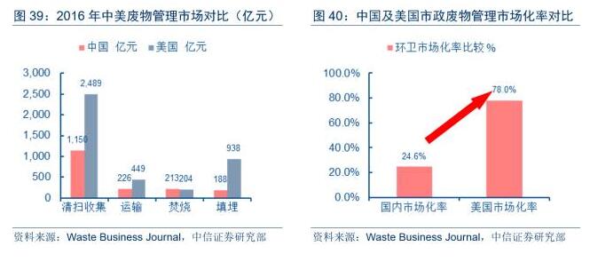 從市場規(guī)模和市場化程度的國際比較看,國內(nèi)環(huán)衛(wèi)市場擴容潛力充分,2016年的美國市政廢物管理市場規(guī)模高達4,080億元(600億美元),是同期國內(nèi)市場規(guī)模的近3倍。對于從事環(huán)衛(wèi)業(yè)務的公司而言,除享受行業(yè)整體高單位數(shù)增長的成長擴容潛力外,更大的成長紅利在于市場化加速推進帶來的訂單轉(zhuǎn)移。從市場化程度看,目前美國市政廢物管理市場的市場化率為78.0%,私營企業(yè)在市場影響力和占有率等方面中擁有支配地位;而根據(jù)我們的測算,目前我國市政廢物管理市場(環(huán)衛(wèi)+最終處置)的市場化率僅為24.6%,其中我們估計環(huán)衛(wèi)的市場化率約為20%,和美國市場差距甚遠?;诖?,市場化率差異蘊含龐大的市場化加速推進帶來的訂單轉(zhuǎn)移釋放機遇。