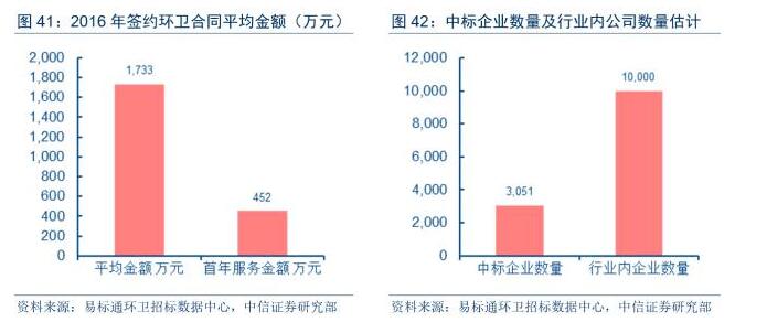 目前國內(nèi)環(huán)衛(wèi)市場參與企業(yè)數(shù)量多,合同規(guī)模小,環(huán)衛(wèi)市場高度分散。根據(jù)易標通環(huán)衛(wèi)招標數(shù)據(jù)中心發(fā)布的《2016年全國環(huán)衛(wèi)服務環(huán)衛(wèi)招標市場年報》,目前全國相對活躍的環(huán)衛(wèi)企業(yè)約有10,000家左右。2016年,全國共有3,234家企業(yè)中標環(huán)衛(wèi)項目,全國各地共發(fā)布環(huán)衛(wèi)招標項目5,497個,按照中標企業(yè)數(shù)量計算,平均每家企業(yè)中標項目數(shù)量為1.7個。此外,從合同規(guī)???,2016年,全國各地新簽環(huán)衛(wèi)服務合同總金額為861億元,平均每個項目的合同金額為1,733萬元;新簽項目的首年服務總金額為224億元,平均每個項目的首年服務金額為452萬元,項目規(guī)模明顯偏小。