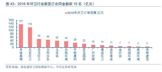 盡管參與企業(yè)眾多,但隨著資本快速進入,龍頭企業(yè)開始快速跑馬圈地,環(huán)衛(wèi)市場訂單逐步在向具有資金&資源&管理的優(yōu)勢企業(yè)集中。根據(jù)易標通環(huán)衛(wèi)招標數(shù)據(jù)中心統(tǒng)計數(shù)據(jù),按照合同規(guī)模排名,2016年國內(nèi)環(huán)衛(wèi)市場簽約規(guī)模前5名企業(yè)為啟迪桑德、北京環(huán)衛(wèi)、龍馬環(huán)衛(wèi)、北控水務、玉禾田等,簽約合同規(guī)模分別為137、119、50、46、40億元。2016年前15名企業(yè)的合同簽約規(guī)模合計為542億元,占全國新簽環(huán)衛(wèi)服務合同總規(guī)模的62.9%。