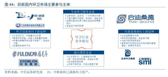 區(qū)域性國企公司:政府資源密切,主要依托當?shù)卣P系開展業(yè)務,在當?shù)丨h(huán)衛(wèi)市場中占據(jù)主導地位,但市場化程度、管理效率和跨區(qū)域運營能力等方面能力偏弱。不過,部分在機制及活力等方面表現(xiàn)突出的區(qū)域性國企未來進一步成長潛力也比較充沛,以北京市國資委下屬的北京環(huán)衛(wèi)等為典型代表。