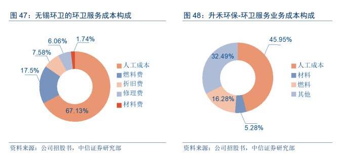 從成本構成看,環(huán)衛(wèi)服務項目成本主要由環(huán)衛(wèi)職工薪酬、保險等人工成本、環(huán)衛(wèi)車輛等環(huán)衛(wèi)設備燃料成本、設備折舊、設備維修費等部分組成,勞動力高度密集導致人工成本占比最大,目前普遍占到環(huán)衛(wèi)運營成本的60%~70%。