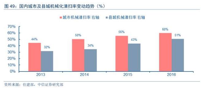 從國內(nèi)機械化率變動趨勢看,近年來持續(xù)處于快速提升趨勢中,其中城市機械化清掃率從2013年的44%提升至2016年的60%,縣城機械化清掃率從2013年的32%提升至2016年的51%,2013~2016年平均分別提升5個及6個百分點。參考海外環(huán)衛(wèi)全部機械化作業(yè)的發(fā)展經(jīng)驗,國內(nèi)機械化率提升仍有較大提升空間。