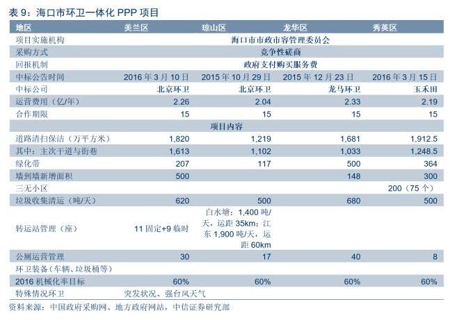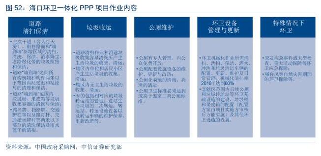 在國家及地方一系列環(huán)衛(wèi)市場化政策推動下,環(huán)衛(wèi)服務業(yè)市場化項目規(guī)模迅速擴大。目前已有許多以PPP模式運營的環(huán)衛(wèi)項目完成招標。在招標時,一種模式為環(huán)衛(wèi)一體化的整體處理項目,包含道路清掃、垃圾清運、公廁維護等分項的項目;除上述模式外,將環(huán)衛(wèi)與后端垃圾焚燒發(fā)電、餐廚及污泥處置等項目綜合打包也開始變得頻繁起來。其中海口環(huán)衛(wèi)一體化PPP項目以及固原市循環(huán)經(jīng)濟產(chǎn)業(yè)園及環(huán)衛(wèi)一體化項目分別為上述模式的典型案例。