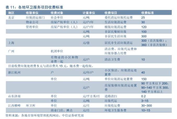目前市場上環(huán)衛(wèi)服務市場化項目回報機制大多是政府支付購買服務費,政府能否及時足額地按照合同標準支付環(huán)衛(wèi)服務費就成為保證環(huán)衛(wèi)服務項目收益的重要一環(huán)。從全國范圍內(nèi)來看,道路清掃保潔和垃圾清運兩項主要業(yè)務的付費并沒有統(tǒng)一標準。對于道路清掃保潔服務,山東濟南象征性規(guī)定收費標準為0.2元/平方米,絕大多數(shù)地區(qū)并不針對這一項目對普通居民進行收費。