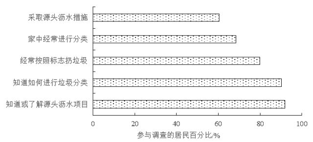 試點(diǎn)小區(qū)內(nèi)設(shè)立了生活垃圾分類督導(dǎo)員,負(fù)責(zé)日常宣傳和監(jiān)督工作。在環(huán)衛(wèi)處的協(xié)調(diào)下,組織居民到固體廢物處理終端和管理中心進(jìn)行現(xiàn)場參觀,普及生活垃圾常識,提高參與積極性。問卷調(diào)查是了解居民對垃圾分類知曉率和參與程度的有效途徑,試點(diǎn)期間在試點(diǎn)小區(qū)發(fā)放調(diào)查問卷150份,收回有效問卷124份,主要結(jié)果列于圖2。調(diào)查顯示,盡管90%以上的居民了解生活垃圾源頭瀝水和分類收集的具體要求,但是僅有60%的居民能夠按照要求采取源頭瀝水并分類投放,居民長期形成的生活習(xí)慣在短時間內(nèi)難以改變。廚余垃圾粉碎機(jī)的實際使用率約為90%,大部分居民對粉碎機(jī)的運(yùn)行效果比較滿意。綜合來看,試點(diǎn)小區(qū)約有60%的居民按要求源頭瀝水和分類投放廚余垃圾,10%的居民使用了廚余粉碎機(jī),其余30%的居民沒有真正參與。