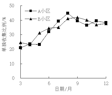 試點(diǎn)期間,兩小區(qū)共單獨(dú)收集廚余垃圾60 t,隨著宣傳引導(dǎo)工作的深入,單獨(dú)收集的廚余垃圾比例逐月升高(圖5),最終穩(wěn)定在40%以上。以廚余垃圾在生活垃圾中的比例為65%計算,按要求源頭瀝水并單獨(dú)投放廚余垃圾的居民比例約為62%,問卷調(diào)查顯示60%的居民能夠按照要求操作,與監(jiān)測結(jié)果基本吻合。