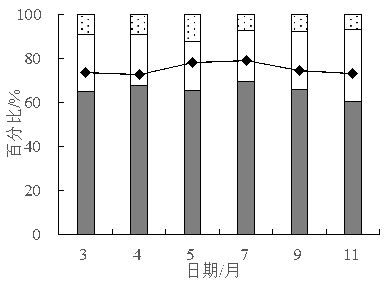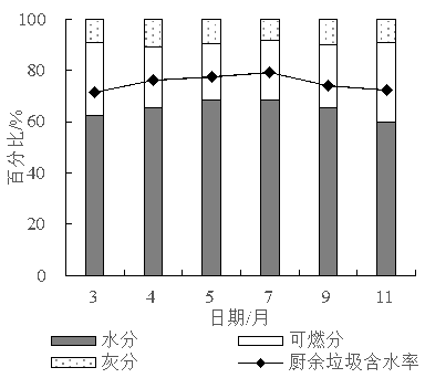 生活垃圾的三組分包括水分、可燃分和灰分(圖6),廚余垃圾平均含水率為75.24%,生活垃圾平均含水率為65.34%,且5~9月含水率最高。夏季水分含量較高的果蔬類廢棄物所占比例明顯高于其他季節(jié),導(dǎo)致廚余垃圾比例升高,含水率隨之升高。利用軟件IBM SPSS statistics 20對生活垃圾含水率和廚余垃圾含水率數(shù)據(jù)分別進(jìn)行W檢驗,在顯著性水平α=0.05條件下均滿足正態(tài)分布。二者Pearson相關(guān)系數(shù)為0.726,在0.01水平(雙側(cè))顯著相關(guān),降低生活垃圾含水率的關(guān)鍵在于降低廚余垃圾含水率。