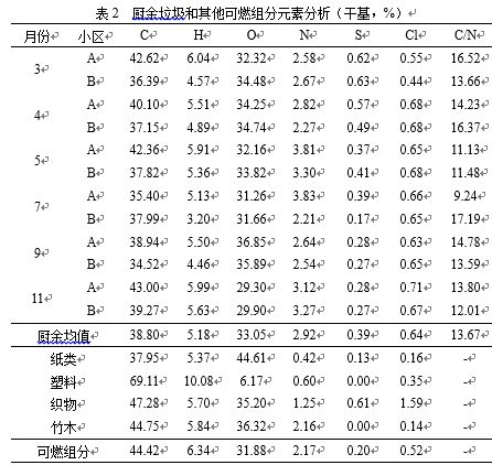對廚余垃圾和其他可燃組分進(jìn)行元素分析(表2),廚余垃圾對可燃組分中N、S、Cl的貢獻(xiàn)率分別為67%、96%、62%,是填埋和焚燒處理時各種污染物的主要來源。食品消費(fèi)結(jié)構(gòu)影響廚余垃圾的元素組成,植物類殘渣越多,C/N值越高。