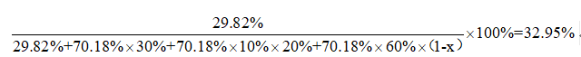 實施試點(diǎn)前,居民區(qū)生活垃圾中廚余組分為70.18%,含水率為67.82%,實施試點(diǎn)后,廚余組分為67.05%,含水率為65.34%。假設(shè)安裝粉碎機(jī)、按要求源頭瀝水和沒有參與源頭瀝水的居民所產(chǎn)生的生活垃圾物理組成相同,非廚余組分的產(chǎn)生量不變。試點(diǎn)后非廚余組分占生活垃圾的比例從29.82%提高到32.95%,利用物質(zhì)守恒定律得到如下方程式(x表示廚余垃圾減量率):