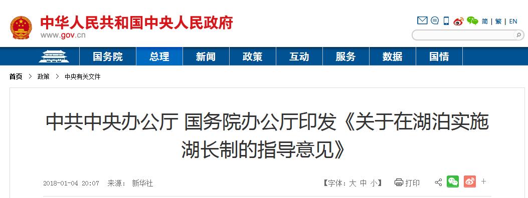 《關(guān)于在湖泊實施湖長制的指導意見》全文如下。