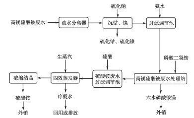 針對鈷冶煉中排出的高鎂硫酸銨廢水,以硫化鈉為沉淀劑去除鈷鎳,采用磷酸二氫銨除鎂+四效逆流降膜真空蒸發(fā)法組合工藝,可綜合回收硫化鈷與硫化鎳、磷酸銨鎂、硫酸銨,其中磷酸銨鎂和硫酸銨產(chǎn)品均達到國家一級標準,最終廢水中氨氮≤ 8 mg/L。生產(chǎn)實踐表明:年處理30萬t高鎂硫酸銨廢水,可回收300 t硫化鎳鈷,1.6萬t六水磷酸銨鎂及4萬t硫酸銨,年銷售收入達600萬元以上,實現(xiàn)了高鎂氨氮廢水的資源化。