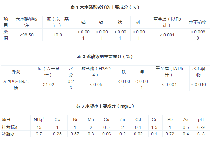 該工藝中回收的產(chǎn)品有硫化鈷與硫化鎳混合物、六水磷酸銨鎂與硫酸銨產(chǎn)品。硫化鈷鎳混合物返回生產(chǎn)系統(tǒng)再分離回收,六水磷酸銨鎂與硫酸銨產(chǎn)品外銷。四效蒸發(fā)器產(chǎn)生的冷凝水返回生產(chǎn)系統(tǒng)或直接外排。硫化鈷鎳混合物中Co占11.25%、Ni占28.45%、NH4+占0.15%、H2O占2.80%。磷酸銨鎂、硫酸銨與冷凝水的成分見表 1~表 3。