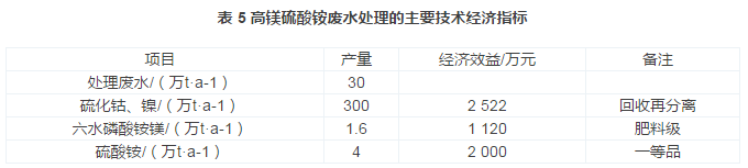 項目設(shè)計年處理30萬t高鎂硫酸銨廢水,年回收300 t硫化鎳鈷、1.6萬t磷酸銨鎂及4萬t硫酸銨產(chǎn)品,年利潤達600萬元以上,并達到了節(jié)水、節(jié)能、資源綜合利用的社會效益,其主要技術(shù)經(jīng)濟指標如表 5所示。