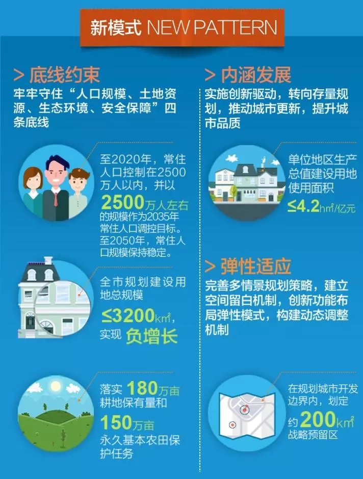 其次,在資源環(huán)境緊約束的背景下,“上海2035”轉(zhuǎn)變了規(guī)劃的思維方式,明確上海的城市發(fā)展要牢固樹立“底線思維”,嚴(yán)守土地、人口、環(huán)境、安全四條底線,實(shí)現(xiàn)內(nèi)涵發(fā)展和彈性適應(yīng),探索超大城市睿智發(fā)展的轉(zhuǎn)型路徑,力爭成為高密度超大城市可持續(xù)發(fā)展的典范。
