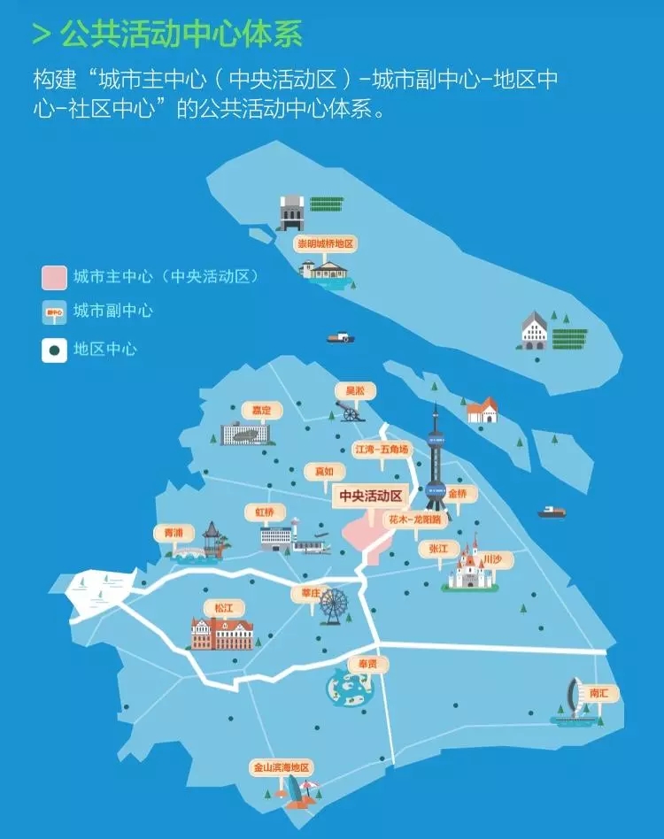 中央活動區(qū)包括小陸家嘴、外灘、人民廣場、徐家匯等十幾個區(qū)域,重點(diǎn)發(fā)展金融服務(wù)、總部經(jīng)濟(jì)、商務(wù)辦公、文化娛樂、創(chuàng)新創(chuàng)意、旅游觀光等全球城市核心功能。城市副中心包括五角場等9個主城副中心、5個新城中心和金山濱海地區(qū)、崇明城橋地區(qū)2個核心鎮(zhèn)中心等,發(fā)展面向長三角和市域的綜合服務(wù)中心,兼顧全球城市部分核心功能。地區(qū)中心和社區(qū)中心主要承擔(dān)所在區(qū)域的公共服務(wù)。