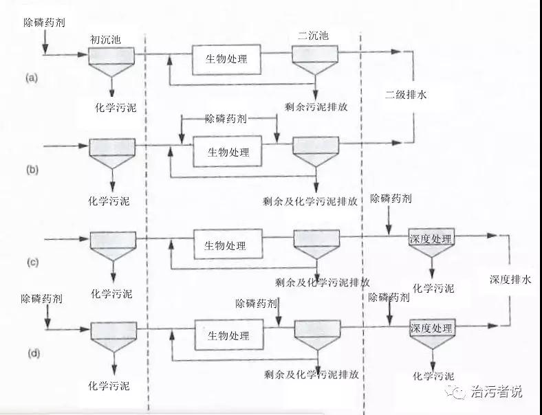 在了解了這三種藥劑的化學(xué)反應(yīng)機(jī)理以后,我們需要了解化學(xué)藥劑在污水廠的投加點。污水處理廠從生物處理階段來說,一般分為一級物理處理,二級生物處理,三級深度處理。而化學(xué)藥劑的投加點也就分別在這三處,根據(jù)與生物處理的位置不同,分為前投加,同步投加,后投加,全投加四種,對應(yīng)于下圖中的a、b、c、d四種模式。