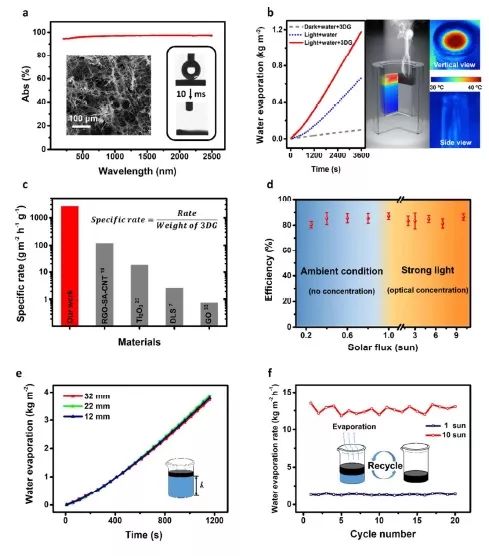 (f) 3DG在1 kWm -2和10 kWm -2太陽能照射下重復使用20次的圖像。