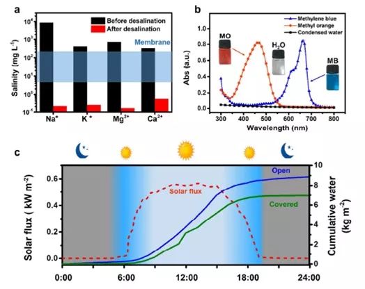 (c) 24小時持續(xù)測量太陽通量和清潔水的生成圖像。記錄一整天(0:00-24:00)的環(huán)境太陽通量(紅線),使用開放設備產生的蒸汽量(藍線)和使用覆蓋設備的冷凝水(綠線)。