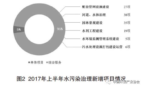 從2017年上半年的環(huán)保上市公司披露項(xiàng)目來看,114個(gè)水污染治理項(xiàng)目中,36個(gè)單體項(xiàng)目,投資總額 65億元;78個(gè)綜合治理項(xiàng)目投資總額達(dá)1364億元。其中,包含配套管網(wǎng)設(shè)施建設(shè)內(nèi)容的項(xiàng)目27個(gè);包含河道水體治理內(nèi)容(指河道清淤、黑臭水體治理等內(nèi)容)的項(xiàng)目38個(gè);包含園林景觀建設(shè)內(nèi)容的項(xiàng)目35個(gè);包含水利工程建設(shè)內(nèi)容的項(xiàng)目19個(gè);包含水環(huán)境監(jiān)測(cè)、管理系統(tǒng)建設(shè)內(nèi)容的項(xiàng)目5個(gè)。以北控水務(wù)同中建一局聯(lián)合中標(biāo)的包頭市城市水生態(tài)提升綜合利用PPP項(xiàng)目為例,該項(xiàng)目集全城域的水利防洪工程、水資源調(diào)配工程、河湖水網(wǎng)連通工程、城市景觀水系工程以及智慧水務(wù)管理工程為一體,估算靜態(tài)總投資達(dá)196億元。2017年上半年水污染治理新增項(xiàng)目情況如圖2。