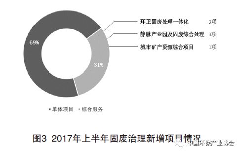 從2017年上半年環(huán)保上市公司披露的項(xiàng)目來看,42個(gè)固廢處理項(xiàng)目中,35個(gè)單體項(xiàng)目,投資總額97億元;7個(gè)綜合項(xiàng)目投資總額43億元。其中,環(huán)衛(wèi)固廢處理一體化項(xiàng)目3個(gè),固廢綜合處理及靜脈產(chǎn)業(yè)園建設(shè)3個(gè)。以中國(guó)天楹中標(biāo)的寧夏固原市循環(huán)經(jīng)濟(jì)產(chǎn)業(yè)園及環(huán)衛(wèi)一 體化項(xiàng)目為例,該項(xiàng)目披露總投資15億元,包含生活垃圾焚燒發(fā)電BOT項(xiàng)目(30年)、餐廚垃圾處置BOT項(xiàng)目(30年)、污泥干化BOT項(xiàng)目(30年)、建筑垃圾循環(huán)利用項(xiàng)目(30年)以及城鄉(xiāng)環(huán)衛(wèi)一體化項(xiàng)目(30年)。 2017年上半年固廢治理新增項(xiàng)目情況如圖3。