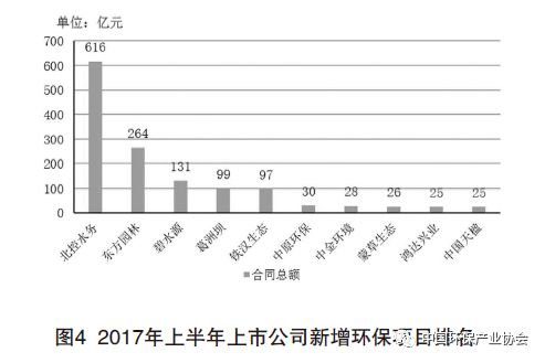 在政策和資本推動(dòng)下,環(huán)保產(chǎn)業(yè)迅猛發(fā)展,環(huán)保企業(yè)規(guī)模逐漸壯大,拿單能力不斷提升。根據(jù)咨詢公司從公開渠道的資料統(tǒng)計(jì),上半年上市公司披露的環(huán)保項(xiàng)目中,北控水務(wù)簽約中標(biāo)環(huán)保項(xiàng)目15個(gè),投資總額616億元(聯(lián)合體項(xiàng)目由于內(nèi)部投資額分配情況不明,因此按牽頭人統(tǒng)計(jì),例如去年中標(biāo)今年簽約的4個(gè)北京市通州區(qū)水環(huán)境治理項(xiàng)目總投資280億元,北控水務(wù)為牽頭人,則全部計(jì)入北控水務(wù)投資),其次,東方園林、碧水源等公司也獲得超過百億元的新增項(xiàng)目,拿單能力分化趨勢(shì)凸顯。2017年上半年上市公司新增環(huán)保項(xiàng)目排名見圖4。