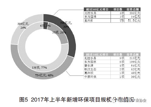 在環(huán)境治理市場(chǎng)向綜合服務(wù)升級(jí)的趨勢(shì)下對(duì)環(huán)保企業(yè)的資金、技術(shù)、資源調(diào)配能力要求越來越高,環(huán)保企業(yè)之間的拿單能力開始分化。上半年大型綜合治理項(xiàng)目主要集中在北控水務(wù)、東方園林、碧水源、國(guó)禎環(huán)保等少數(shù)幾個(gè)環(huán)保企業(yè)手中。6個(gè)超過50億元的項(xiàng)目,分別來自北控水務(wù)(4項(xiàng))、東方園林(1項(xiàng))、葛洲壩(1 項(xiàng))。項(xiàng)目投資額在10億~50億元之間的35個(gè)項(xiàng)目中, 北控水務(wù)、東方園林、碧水源獲得21項(xiàng)。2017年上半年新增環(huán)保項(xiàng)目規(guī)模分布情況如圖5。