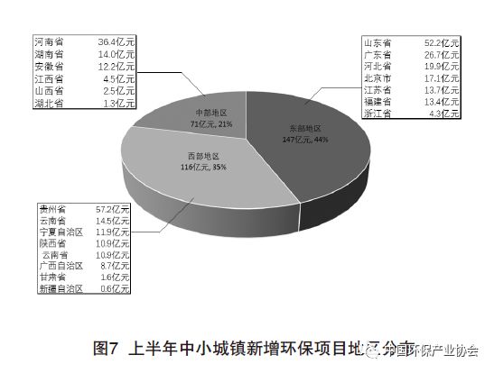 從地域分布來看,貴州、山東、河南、廣東等省市中小城鎮(zhèn)環(huán)保項(xiàng)目總投資額較大。總體來看,東部地區(qū) 中小城鎮(zhèn)環(huán)保市場(chǎng)活躍,投資額占比超過44.1%,中部地區(qū)占比21.2%,西部地區(qū)占比34.8%。2017年上半年中小城鎮(zhèn)新增環(huán)保項(xiàng)目地區(qū)分布見圖7。