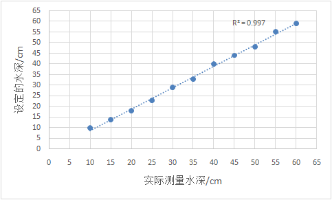 液位計傳感器是內(nèi)澇監(jiān)控點液位監(jiān)測系統(tǒng)的重要組成,其監(jiān)測數(shù)據(jù)直接影響到排水管網(wǎng)的調(diào)度管理決策及深隧排水系統(tǒng)的調(diào)度優(yōu)化研究結果。液位計傳感器需要選擇精度高、量程合適、穩(wěn)定性好的類型。此外,由于內(nèi)澇點通常位于城市的馬路上或人行道上,并且分布較為分散,電力和通訊設備難以匹配到位,應選取低能耗的類型;且排水管網(wǎng)的污水環(huán)境較為惡劣,需選用防水等級IP68、材質(zhì)耐腐蝕的設備。針對本系統(tǒng)所選用的壓阻式液位傳感器,在實驗室模擬排水管道窨井,放入液位計并改變窨井中液位,進行實際測量液位與設定液位的線性回歸分析,測量液位值呈現(xiàn)的線性度良好,測量值與設定值線性相關系數(shù)為0.9975,誤差較小,精度符合要求(見圖2)。此外,在測試過程中,同一液位情況下,多次進行測量,測量液位變化不大,穩(wěn)定性良好。