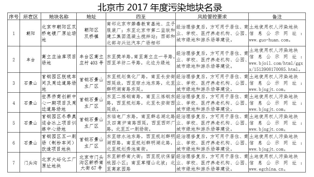 2017年12月26日 北京市環(huán)境保護局公布了《北京市2017年度污染地塊名錄》, 共有7塊污染地塊。