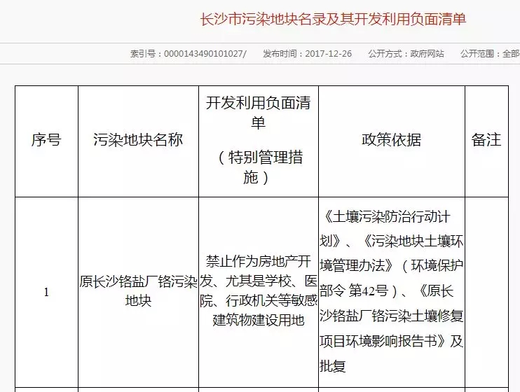 2017年12月26日 長沙市環(huán)境保護局公布了《長沙市污染地塊名錄及其開發(fā)利用負(fù)面清單》,共有6塊污染地塊。