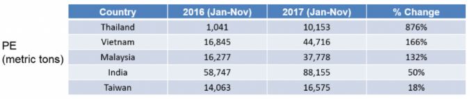 對于PE而言,印度2017年的成交量增加最大,2017年進口量為88,155噸,而16年同期為58,747噸。