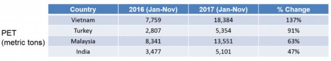 對于PET廢料,東南亞國家進口量也出現(xiàn)大幅增長。