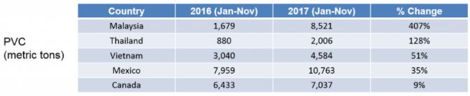 對于PVC廢料,馬來西亞2017年的進口量增長了407%,達到8,521噸。