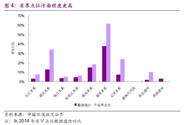 我國河流污染情況依舊嚴重,整體雖有所好轉(zhuǎn),但2011-2015年期間改善不明顯。根據(jù)2015年中國環(huán)境狀況公告顯示,長江、黃河、珠江、松花江、淮河、海河、遼河等七大流域和浙閩片河流、西北諸河、西南諸河的700個國控點位中;IV類占14.3%,V類占4.7%,劣V類占8.9%且主要集中在海河、淮河、遼河和黃河流域。海河監(jiān)控點位水質(zhì)劣V類達到39.1%,其中支流劣V占比更是高達44.0%。