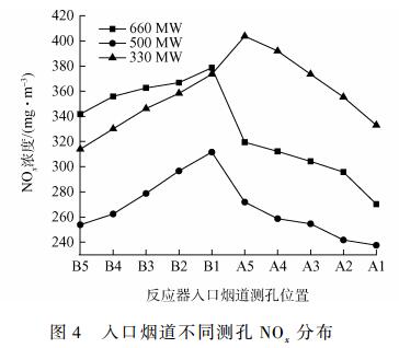 2)在660、500、330MW負荷下,反應器入口煙道NOx均值偏差分別為13.4%、17.1%、18.1%,而速度均值偏差分別為6.1%、6.4%、6.6%。不同測孔位置濃度場分布差異性較大,是噴氨格柵優(yōu)化調整的一個不可忽視的重要因素,而反應器入口速度場分布相對均勻,對噴氨格柵優(yōu)化調整影響較小。