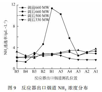 可知,機組調前在660MW負荷下,均值濃度分別為56、43.5mg?m-3,但不同測孔的NOx濃度差異較大,其中B側NOx濃度最大偏差為74.7mg?m-3、而A側為56.2mg?m-3。噴氨格柵優(yōu)化調整后,NOx均值濃度基本不變,而在660、500、330MW負荷下,NOx濃度差異性均明顯降低,B側最大偏差分別降至3.9、13.6、8.6mg?m-3,而A側對應偏差分別為7.9、7.0、15.1mg?m-3。