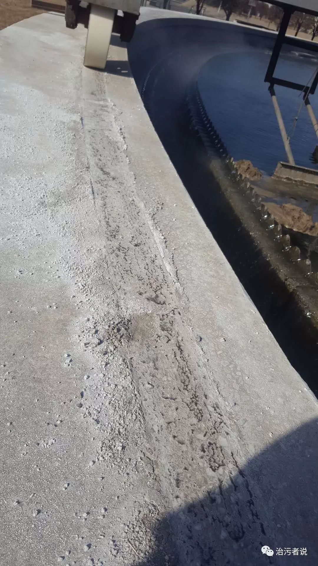 初沉池的刮泥機(jī),二沉池的管吸泥機(jī),在工藝運行中是需要連續(xù)不斷的行進(jìn),把圓形或矩形的沉淀池底部的污泥刮走或者吸走,才能保證整個工藝的運行穩(wěn)定。采用周邊驅(qū)動的刮(吸)泥機(jī)的設(shè)備,一般會把電機(jī)和行走輪放在圓形(矩形)池邊上,通過電機(jī)驅(qū)動行走輪來帶動整個刮(吸)泥機(jī)的運行。在降雪的天氣內(nèi),這種運行會受到雪的影響。雪落在行走軌道上,被行走輪壓實后,形成雪層,造成行走輪的打滑,使刮(吸)泥機(jī)長時間在一個位置運行,池底的污泥無法全部排出,造成工藝運行的異常。一般污水廠都會采用撒融雪劑的方式來進(jìn)行軌道上的雪的消融,但是會帶來其他的問題。如果下雪停了之后,沒有及時清理干凈軌道表面的融雪劑,融雪劑中的氯化物,會和軌道上的硅酸鹽水泥發(fā)生反應(yīng),使硅酸鹽水泥變酥,在軌道的上行走輪的不斷碾壓下,在軌道上形成一個個坑洼,嚴(yán)重的會使行走輪陷入,造成設(shè)備和工藝的故障。