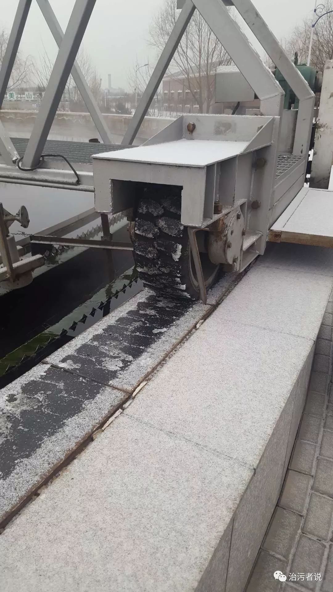 再從污水廠內(nèi)部來看看降雪的影響。對于污水廠來說,降雪帶來的工藝設(shè)備運行的異常工況是重點問題。污水廠由于處理構(gòu)筑物體積較大,絕大部分構(gòu)筑物處于露天建設(shè)。很多設(shè)備在露天放置,都會采取一些防水的密閉措施,可以很好的避免水進(jìn)入機(jī)器或者電動機(jī)內(nèi)部。但是對于降雪來說,會給現(xiàn)場運行的機(jī)械帶來另外的問題,那就是行走輪的打滑問題。