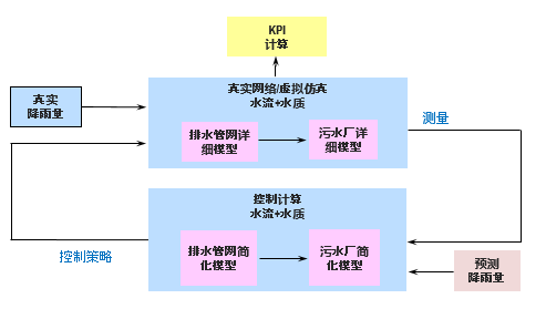 采用預(yù)測(cè)降雨量(約半小時(shí)之內(nèi)),結(jié)合水流、水質(zhì)簡(jiǎn)化模型,管網(wǎng)優(yōu)化目標(biāo)以及物理約束等計(jì)算出一段采樣時(shí)間內(nèi)的最優(yōu)控制策略(主要針對(duì)水閥水泵)并賦給管網(wǎng)仿真系統(tǒng)或真實(shí)管網(wǎng)系統(tǒng),優(yōu)化控制軟件采用自主研發(fā)平臺(tái)MPCTool;