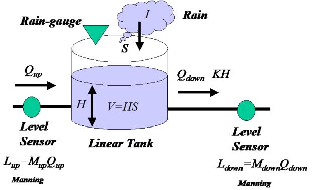 如圖3所示,Linear Tank代表集水區(qū),I 為降雨強(qiáng)度,S為集水區(qū)表面積,Lup,Ldown為上下游水位值,通過水位水流轉(zhuǎn)換系數(shù),可計(jì)算的上游、下游水流量Qup,Qdown,其中Lup,Ldown以及I降雨強(qiáng)度分別由水位傳感器和雨量計(jì)測(cè)量提供,是模型校驗(yàn)的訓(xùn)練數(shù)據(jù)集 [2]。
