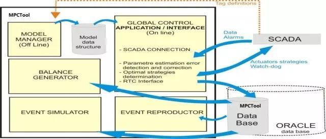 MPCTool是由西班牙科學(xué)院與加泰羅尼亞理工大學(xué)共同開發(fā)的城市排水系統(tǒng)集成在線控制平臺(tái) (圖6)。MPCTool基于上述水流、水質(zhì)簡(jiǎn)化模型和魯棒MPC控制方法,通過一定時(shí)間內(nèi)預(yù)測(cè)降雨優(yōu)化系統(tǒng)目標(biāo),并產(chǎn)生針對(duì)閥門水泵等可控部件的最優(yōu)策略來實(shí)現(xiàn)最小化城市內(nèi)澇、減少溢流及污染物泄露等現(xiàn)象。