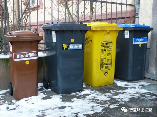 德國(guó)用于分類投放的垃圾桶,其中棕色(也有可能是綠色)為有機(jī)廢物、黑色為剩余廢物(垃圾)、黃色為各類包裝、藍(lán)色為紙類