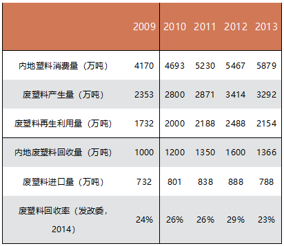 廢塑料是生活垃圾可回收物中增長(zhǎng)最快的部分。根據(jù)《中國(guó)資源綜合利用年度報(bào)告(2014),國(guó)家發(fā)展改革委員會(huì)》公布的數(shù)據(jù)(見下表),2009~2013年我國(guó)廢塑料回收利用率為23%~29%。