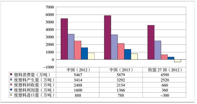 扣除廢塑料焚燒回收利用部分,中國(guó)內(nèi)地廢塑料回收利用率明顯高于歐盟。以2012年數(shù)據(jù)作為對(duì)比,中國(guó)內(nèi)地廢塑料回收量是1600萬(wàn)噸,廢塑料回收率是46.9%,進(jìn)口廢塑料量是888萬(wàn)噸,合計(jì)回收廢塑料是2488萬(wàn)噸,廢塑料使用量占當(dāng)年塑料消費(fèi)量比例為45.5%;而2012年,歐盟(27國(guó))廢塑料回收量是660萬(wàn)噸,廢塑料回收率是26%,歐盟回收的廢塑料45%約300萬(wàn)噸用于出口(其中87%出口到中國(guó)大陸),實(shí)際歐盟本土廢塑料使用量約360萬(wàn)噸,廢塑料使用量占當(dāng)年塑料消費(fèi)量比例為8%。